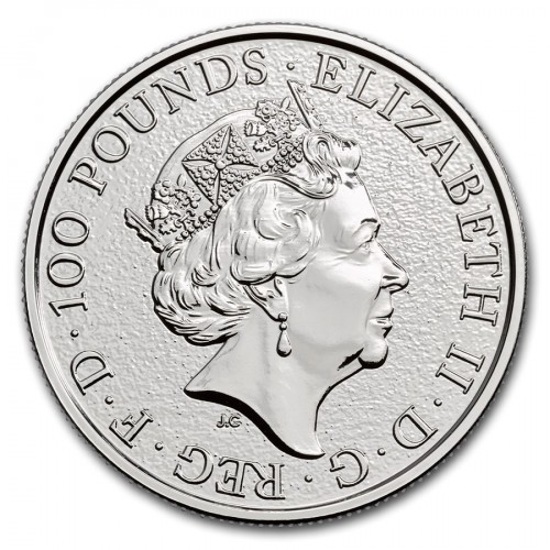 На аверсе платиновой инвестиционной монеты "Лев Англии" - портрет Ее Величества Королевы Елизаветы II, выполненный Джоди Кларком, представленный на британских монетах с 2015 года (так называемый пятый тип монетного портрета королевы). По краю монеты расположены надписи, указывающие на номинал монеты и имя Королевы: 100 POUNDS / ELIZABETH II / D / G / REG / F / D.