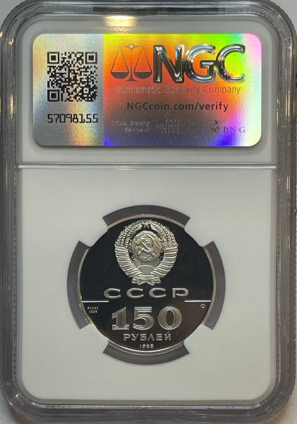 Платиновая монета 150 рублей "Слово о полку Игореве" 500-летие Единого Русского Государства 1988г., Pt 999, 15,55г., ЛМД в слабе NGC PROOF 70 ULTRA CAMEO