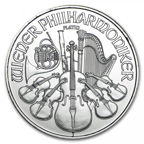 На реверсе платиновой монеты австрийский Филармоникер изображены различные музыкальные инструменты, такие как контрабас, виолончели, скрипки, фагот, арфа и труба. Сверху надпись – WIENER PHILHARMONIKER