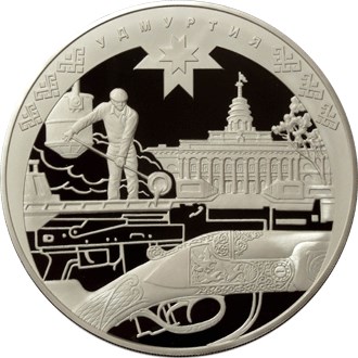 в картуше слева - рабочий-металлург в процессе работы, справа - здание главного корпуса бывшего Ижевского оружейного завода, внизу - фрагмент колодки охотничьего ружья с резным орнаментом, за ним - контурное изображение автомата Калашникова, вверху на матированном картуше с орнаментом - восьмиконечный солярный знак и надпись по окружности: "УДМУРТИЯ".