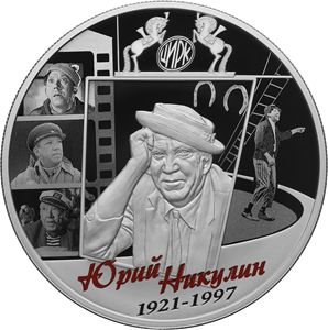 на зеркальном поле диска — рельефное изображение портрета Юрия Никулина в окружении изображений образов артиста: слева, на стилизованном изображении кинопленки, — из кинофильмов и телепередачи, справа — из циркового номера; вверху — рельефное изображение логотипа Московского цирка Никулина на Цветном бульваре, внизу — выполненная в цвете надпись «Юрий Никулин» и годы жизни: «1921–1997».