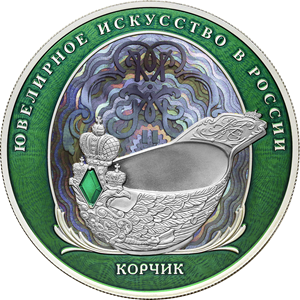 рельефное изображение изделия фирмы «Фаберже» – серебряного корчика; фон с вензелем Николая II, напоминающий формой яйцо, выполнен с эффектом интерференции света и обрамлен овальной рельефной рамкой с декоративным орнаментом; внешняя часть фона, а также изображение изумруда на корчике выполнены с применением цветной эмали; имеются надписи: вверху по окружности – «ЮВЕЛИРНОЕ ИСКУССТВО В РОССИИ», внизу – «КОРЧИК».
