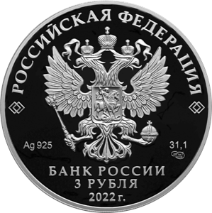 рельефное изображение Государственного герба Российской Федерации, над ним вдоль канта – надпись полукругом: «РОССИЙСКАЯ ФЕДЕРАЦИЯ», обрамленная с обеих сторон сдвоенными ромбами, под гербом: слева – обозначения драгоценного металла и пробы сплава, справа – содержание химически чистого металла и товарный знак монетного двора, внизу в центре в три строки – надпись: «БАНК РОССИИ», номинал монеты: «3 РУБЛЯ», год выпуска: «2022 г.».