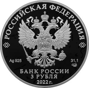 рельефное изображение Государственного герба Российской Федерации, над ним вдоль канта — надпись полукругом: «РОССИЙСКАЯ ФЕДЕРАЦИЯ», обрамленная с обеих сторон сдвоенными ромбами, внизу под гербом: слева — обозначения драгоценного металла и пробы сплава, справа — содержание химически чистого металла и товарный знак монетного двора, внизу в центре в три строки — надпись: «БАНК РОССИИ», номинал монеты: «3 РУБЛЯ», год выпуска: «2022 г.».