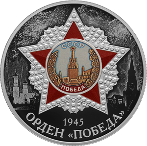 выполненное в цвете рельефное изображение ордена «Победа» на фоне изображений Кремля и праздничного салюта; внизу вдоль канта — надпись: «ОРДЕН «ПОБЕДА», над ней — дата: «1945».