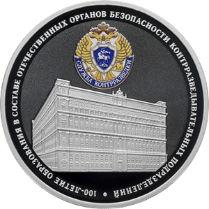 рельефное изображение главного здания ФСБ на Лубянской площади, над ним – выполненное в цвете изображение эмблемы Службы контрразведки ФСБ на матовом поле; по окружности – рельефная надпись, разделенная точкой: «100-ЛЕТИЕ ОБРАЗОВАНИЯ В СОСТАВЕ ОТЕЧЕСТВЕННЫХ ОРГАНОВ БЕЗОПАСНОСТИ КОНТРРАЗВЕДЫВАТЕЛЬНЫХ ПОДРАЗДЕЛЕНИЙ».