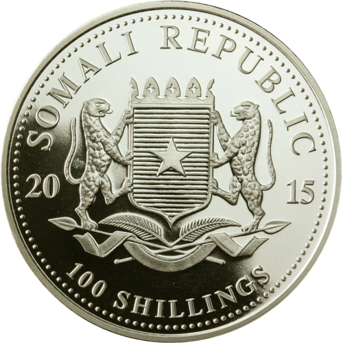 Реверс: В центре - рельефное изображение герба Республики Сомали, справа и слева от герба - год выпуска 2015. Сверху и снизу надписи: SOMALI REPUBLIC (Республики Сомали) и номинал монеты 100 SHILLINGS (100 шиллингов).