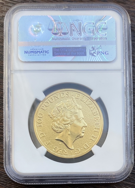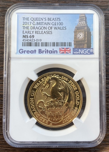 Еще один вариант дизайна из знаменитой нумизматической инвестиционной коллекции британской правящей фамилии «Звери королевы». Объект инвестиций и охоты ценителей эксклюзивной нумизматики, монеты Красный дракон Уэльса выполнены из золота 9999 пробы и имеет номинал 100 фунтов.