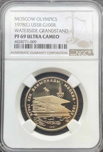 Золотая монета 100 рублей "Гребной канал в Крылатском" 1978г в слабе NGC Proof 69 ULTRA CAMEO