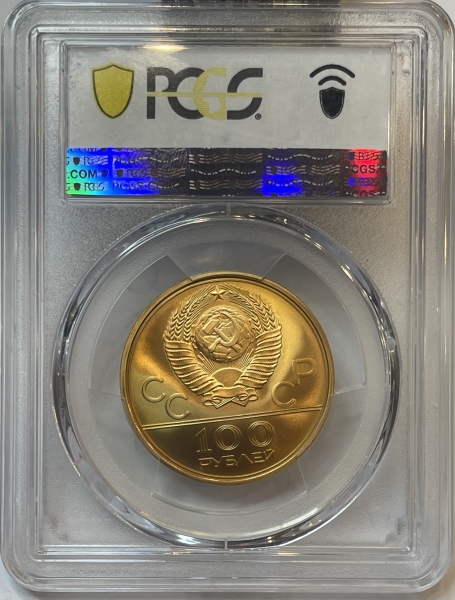 Сверху герб СССР с 15 витками ленты, слева от него буквы «СС», справа «СР», ниже двойная черта, под ней обозначение достоинства монеты цифра «100» и ниже слово «РУБЛЕЙ».