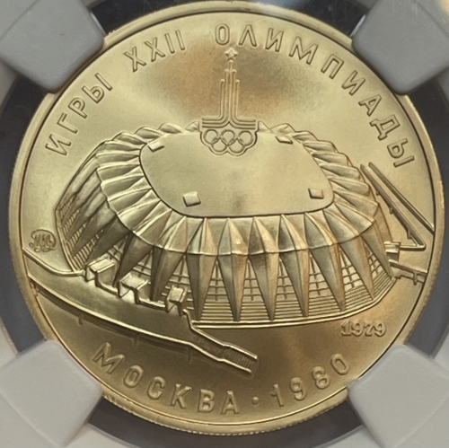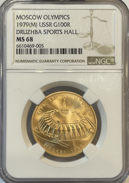 Золотая монета 100 рублей "Спортивный зал Дружба" Олимпиада 80, 1979г., в слабе NGC MS 68