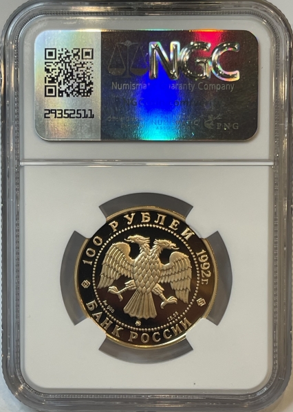 в центре диска, в круге из точек - эмблема Банка России (двуглавый орёл с опущенными крыльями), под ним слева – обозначения драгоценного металла и пробы сплава, в центре – товарный знак монетного двора, справа – содержание драгоценного металла в чистоте, вдоль канта по окружности – надписи, разделенные двумя сдвоенными ромбами, вверху – номинал и год выпуска: "100 РУБЛЕЙ 1992 г.", внизу: "БАНК РОССИИ".