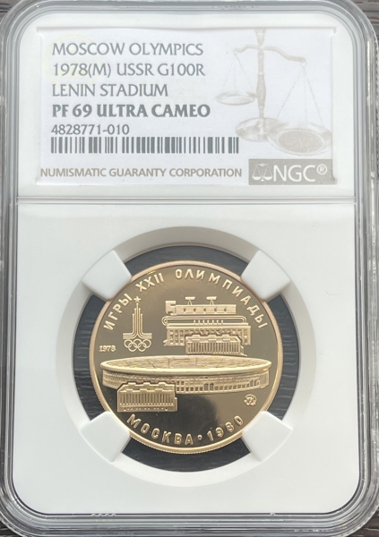 Золотая монета 100 рублей "Стадион имени Ленина в Москве" Лужники 1978г. ММД В слабе NGC PROOF 69 ULTRA CAMEO