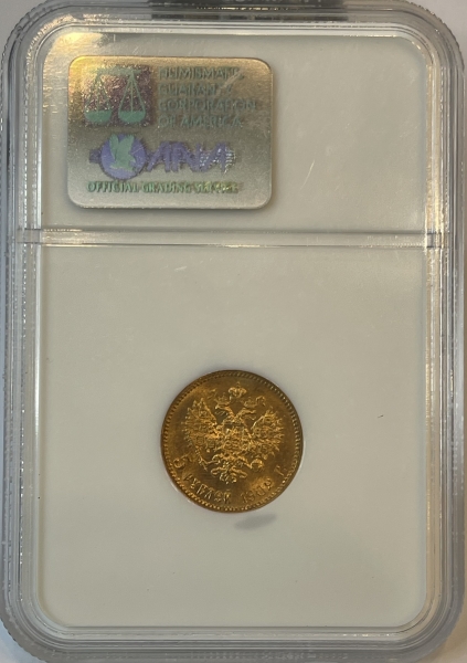 Золотая монета 5 рублей Николай II 1902 г. в слабе NGC MS 66