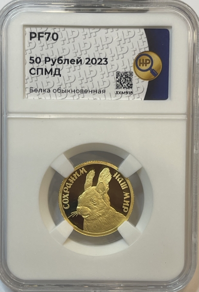 Золотая монета 50 рублей "Белка обыкновенная" 7,78г., Au 999, 2023г., в слабе ННР PROOF 70