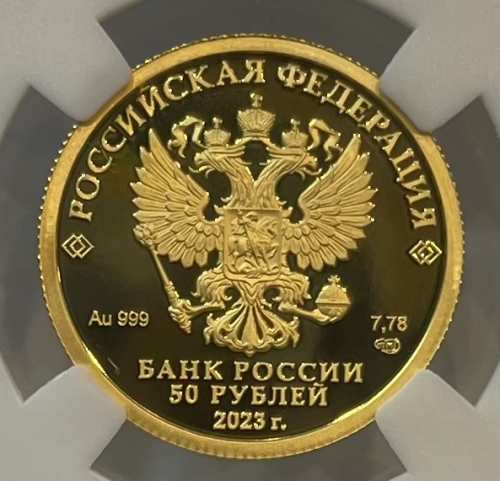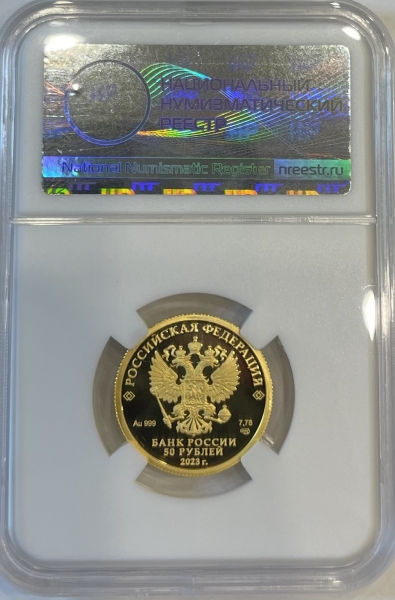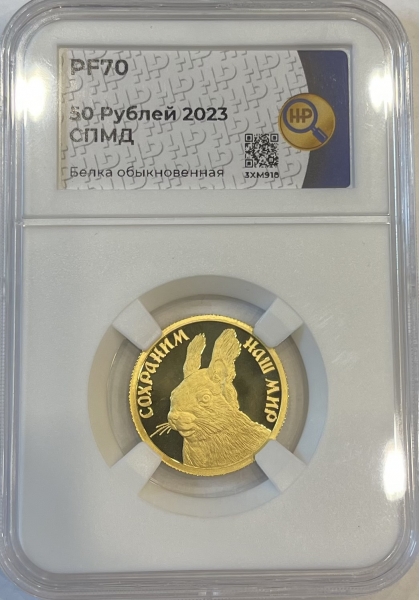 Золотая монета 50 рублей "Белка" в слабе ННР PROOF 70 ,7,78г, 2023 год