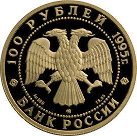 в центре диска - эмблема Банка России (двуглавый орёл художника И. Билибина), в нижней части - обозначение металла, проба сплава, товарный знак монетного двора и содержание драгоценного металла в чистоте. По окружности надписи, обрамлённые кругом из точек: вверху - "100 РУБЛЕЙ 1995 г.", внизу - "БАНК РОССИИ".