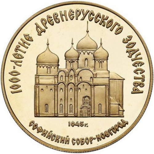 Сверху вдоль канта слова «1000-ЛЕТИЕ ДРЕВНЕРУССКОГО ЗОДЧЕСТВА», в середине изображение Софийского собора в Великом Новгороде, под ним год постройки собора «1045», внизу вдоль канта слова разделенные точкой «СОФИЙСКИЙ СОБОР» и «НОВГОРОД».
