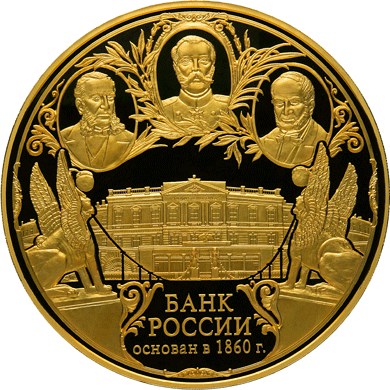 в центре - здание Центрального управления Государственного банка в Санкт-Петербурге в 1860-1918 гг., на переднем плане - два грифона и фрагменты Банковского моста, вверху в овальных медальонах - портреты: в центре - Александра II , справа - Штиглица А.Л., слева - Ламанского Е.И.; внизу - надпись в три строки: "БАНК РОССИИ ОСНОВАН В 1860 г.".