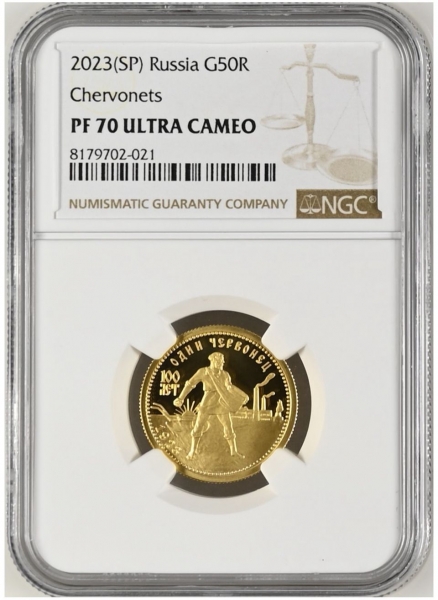 Золотая монета Червонец Сеятель 2023г., 100 лет Червонцу Сеятелю , в слабе NGC PROOF 70 ULTRA CAMEO