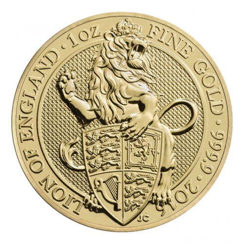 На реверсе золотой инвестиционной монеты "Лев Англии" - изображение льва в короне, держащего лапой щит. По кругу монеты - надписи на английской языке, обозначающие "Лев Англии", 1 тройская унция чистого золота 999,9. Здесь же указан год выпуска монеты - 2016, а также инициалы дизайнера монеты - JC (Jody Clark).